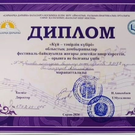 «Ғ.Жұбанова ат.БӨМ» КМҚК «Күй – тәңірдің күбірі» атты облыстық домбырашылар фестиваль – байқауына қатысып, жүлделі орындарды иеленген оқушылар мен олардың педагогтарын құттықтайды.Шығармашылық табыстар тілейміз! Қанат Нұртілек (9-10жас) 1орын